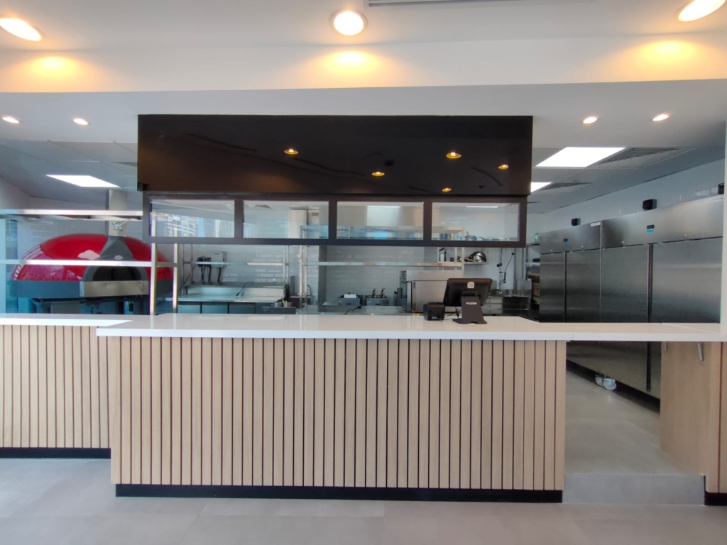 The Sopranos Pizza interior design blends classic Italian charm with modern elegance, creating a warm and inviting atmosphere. Exposed brick walls, reclaimed wood, and industrial metal accents provide a rustic yet contemporary aesthetic, while Mediterranean-inspired tiles and subtle Italian motifs enhance authenticity. The layout includes a mix of communal tables, intimate booths, and bar seating, complemented by an open kitchen concept featuring a visible pizza oven for an interactive dining experience. Warm pendant lighting and Edison bulbs create a cozy ambiance, while large windows maximize natural light. Custom signage, vintage typography, and hand-painted murals reinforce the brand’s identity, with decorative elements like pizza peels, espresso machines, and black-and-white Italian photography adding character and nostalgia.